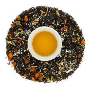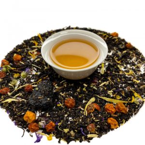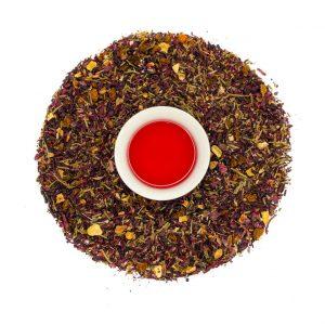 Гибискус, смородина, малина, ежевика, рябина, листья земляники, изюм, шиповник, клубника. Ароматизирован натуральными маслами. Сбор для укрепления иммунитета и хорошего настроения.