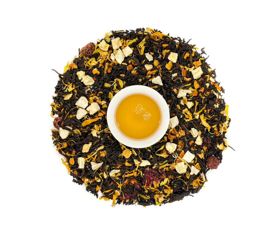 Девочка с персиками — это фруктовый черный чай, созданный для любителей ярких фруктово-ягодных ароматов. Купаж сочетает крупнолистовой черный чай с кусочками персика, яблочной цедрой, апельсином, ягодами малины и лепестками календулы, а натуральные масла усиливают сладкие и цитрусовые ноты напитка.