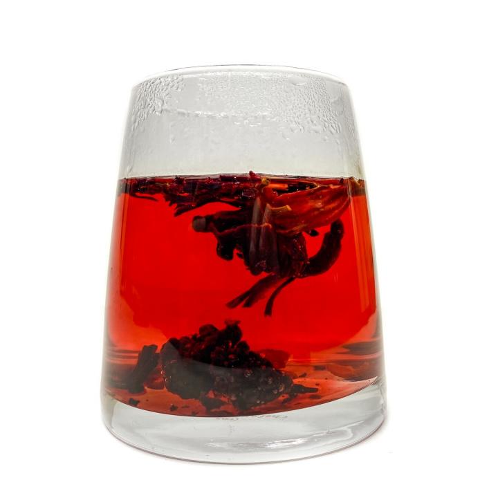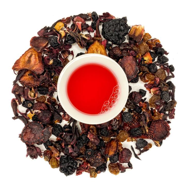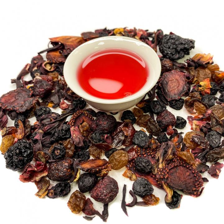 Гибискус, смородина, малина, ежевика, рябина, листья земляники, изюм, шиповник, клубника. Ароматизирован натуральными маслами.