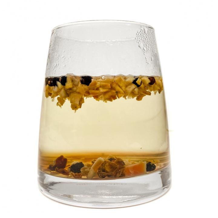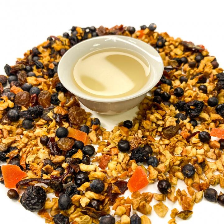 Микс без чайной основы из кубиков яблока, шиповника, ягод смородины, можжевельника, изюма и кусочков всеми любимой папайи.