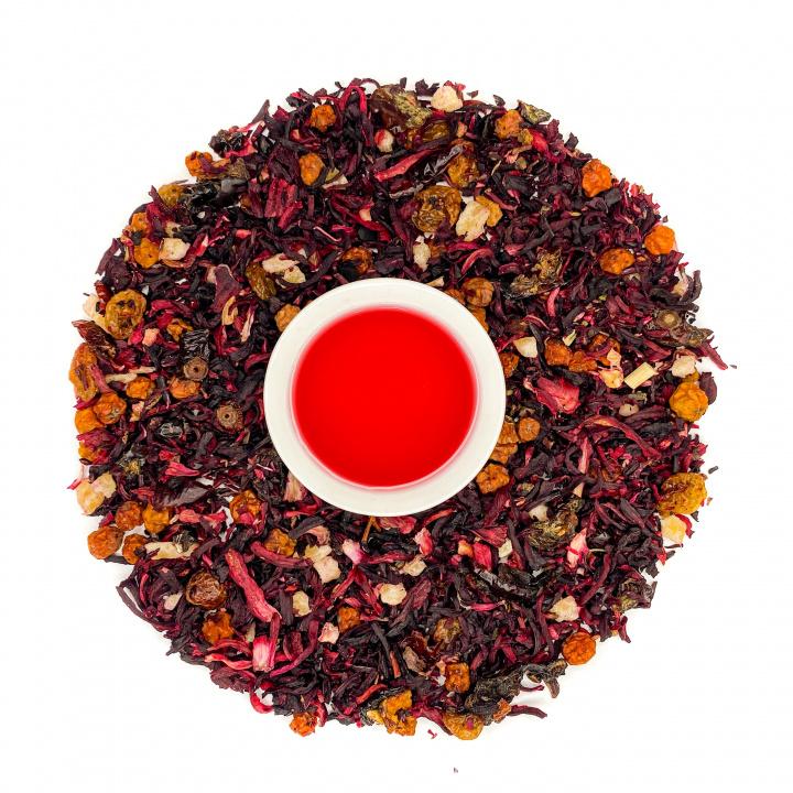 Купаж на основе среднелистового каркаде с добавлением рябины, изюма, кусочков ананаса и шиповника. Ароматизирован натуральными маслами. Сочетание ягодного аромата, кислинки, терпкости гибискуса и фруктовой сладости. Десертный купаж поднимает настроение, снимает стресс и усталость. Сладкий, манящий, насыщенный!