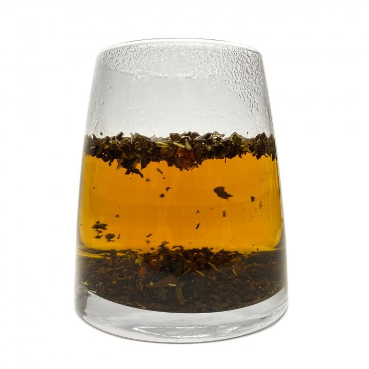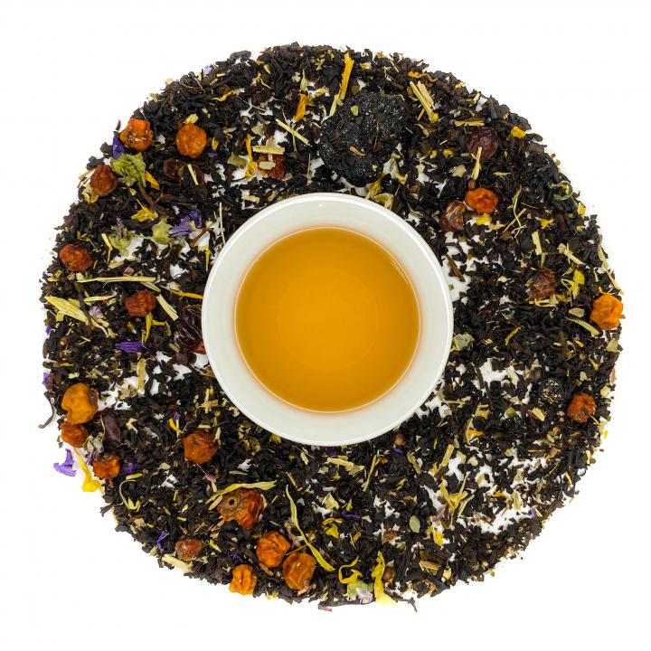 Чай черный, рябина, черника, ежевика, календула, василек, листья ежевики. Ароматизирован натуральными маслами.